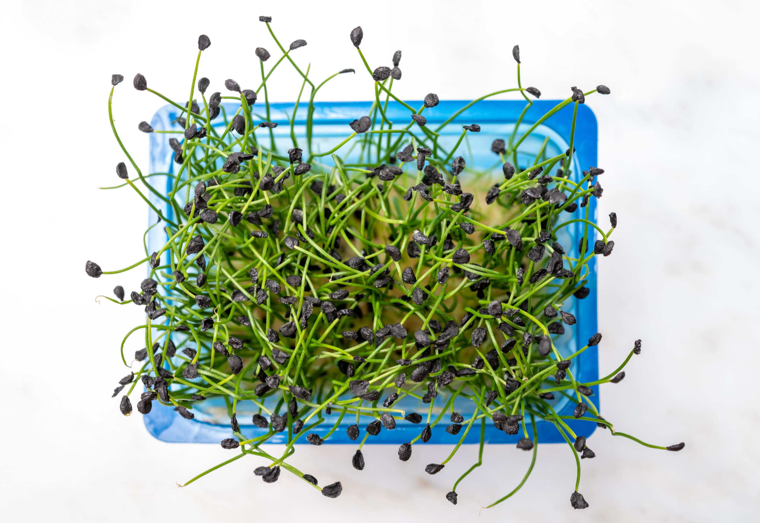 Garlic chives (Allium tuberosum) are a hardy perennial herb with flat, grass-like leaves and a mild garlic flavor. The seeds produce sprouts that have a subtle garlic aroma and taste, making them a popular addition to salads, sandwiches, and garnishes.